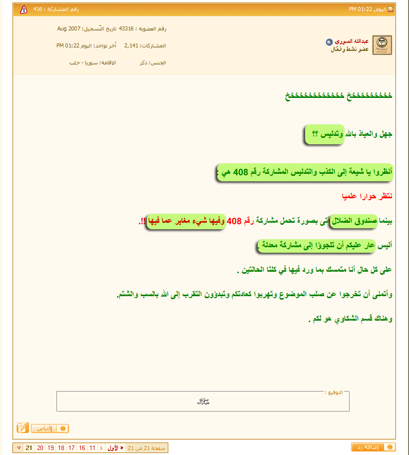 أنظروا يا شيعة إلى الكذب والتدليس المشاركة رقم 408 هي :