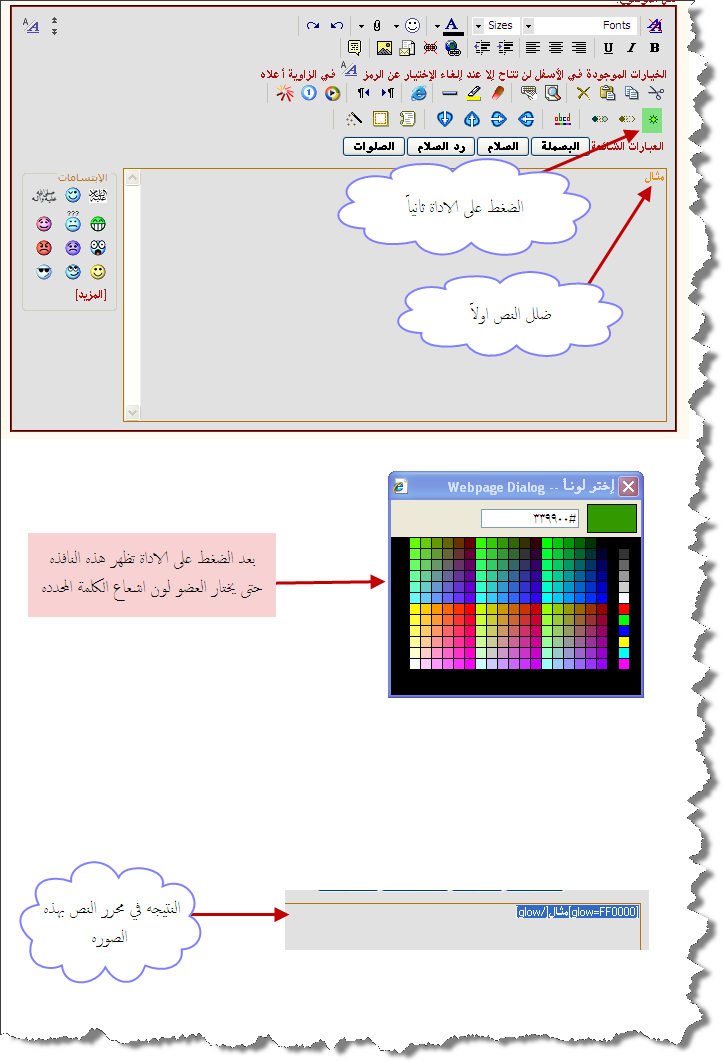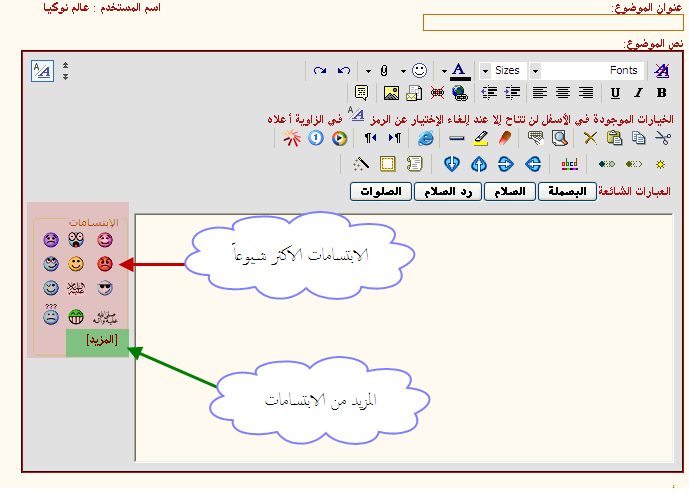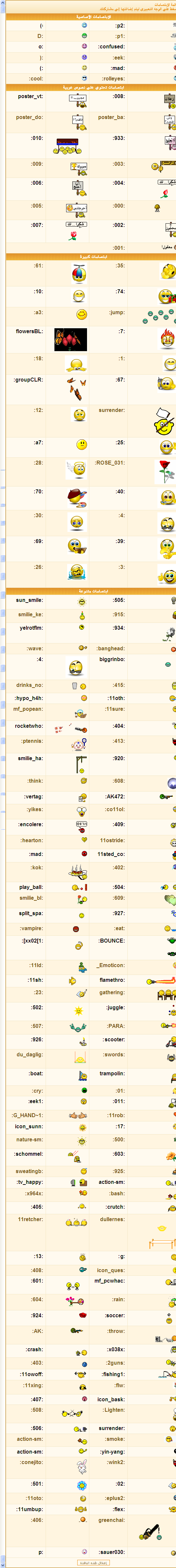 5- الابتسامات :- عند الضغط على هذه القائمه تظهر للعضو مجموعة مصغره من الابتسامات