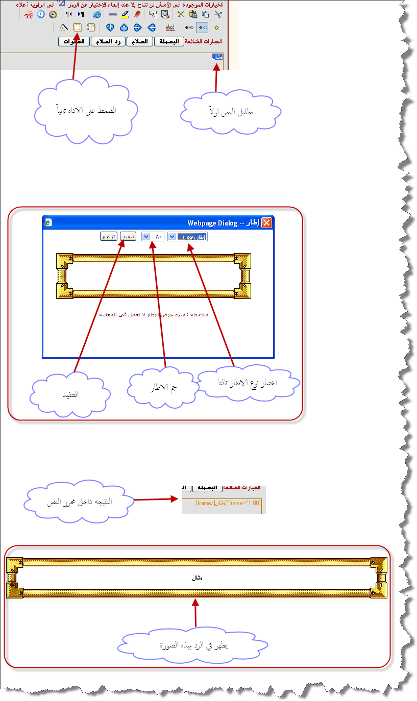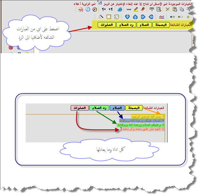 طريقة العمل هي فقط تديد المكان الذي يود العضو وضع احد العبارات فيه ثم يضغط على الاداة مع مراعات ان يكون الخيار غير مفعل لأكمال العمليه