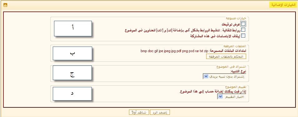 1-عرض التوقيع :- عند عدم اخيار هذا الخيار يؤدي الى اخفاء توقيع العضو صاحب الرد في رده