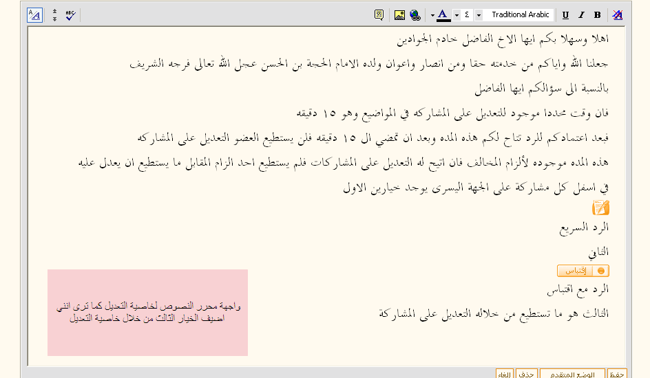 يجعلني حائرا وانا ارى البعض من مشاركاتي فيها اخطاء او لم ترفع بالشكل الصحيح حتى تكون مبهمه لاتقدم للمنتدى اى فائده ارجوك ان لاتبخل على بهذه المعلومه انت او من يقرا هذا الاستفسار وجزاكم الله خير الجزاء والحمد لله رب العالمين والسلام على اشرف الانبياء والمرسلين محمد واله الطيبين الطاهرين**