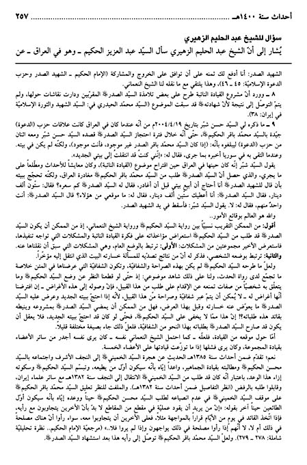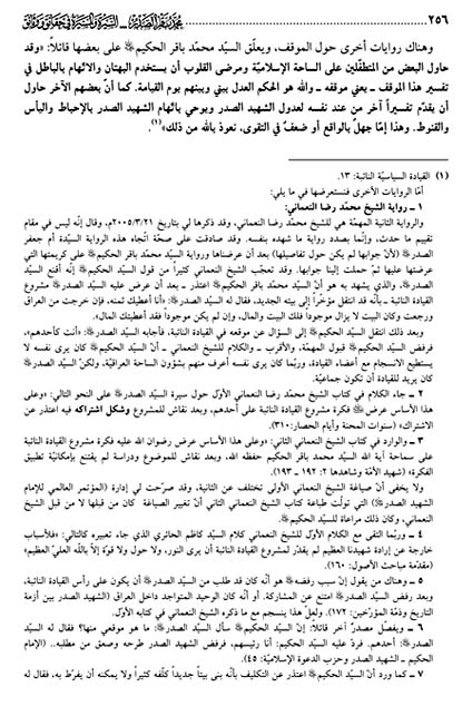 وليس الكلام في أصل وقوع حادثة (القيادة النائبة) ، فقد حصلت كما تؤيدها الأحاديث ، ولكن الكلام في التبريرات ، وكلام السيد الحكيم عندنا أنسب لأنه هو المعني بالموضوع ، وقطعا أن تلك التبريرات التي يرفض بعضها الحكيم ، حتى مع فرض وجودها فإنها لم تكن تنقل مباشرة من فم السيد الى اذن الشهيد ، ولكنها كانت بتوسط بين السيد عبدالعزيز الحكيم رحمه الله والشيخ النعماني قطعا ، على ما هو واضح من طريقة التخاطب عبر(الصينية) في (السطوح) ، وهذه الصينية لا تنقل المشاعر والاحاسيس وكل الكلام، بل جزءه حسب الحال ، وهذا ما يفسر اصرار النعماني على أقواله لأن ذلك ما وصل إليه لا ما توصل إليه ، خصوصا وأنه رأى الشهيد الصدر على تلك الحالة بعد رفض المشروع.