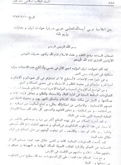 وكانت رسالة الشيخ الشهيد صدوقي الى الامام الخوئي بتاريخ 22 / 11 / 1978 في خصوص زيارة فرح ديبا للامام الخوئي ، وكانت له رسالة اخرى يعاتب فيها الامام حول عدم اتخاذ مواقف منه تجاه الثورة مع أنه قد ملئت رسائله الثورية سابقا الساحات وكان معلوما للجميع مواقفه من الثورة الاسلامية ونهضة الامام الخميني رحمه الله فيما سبق!