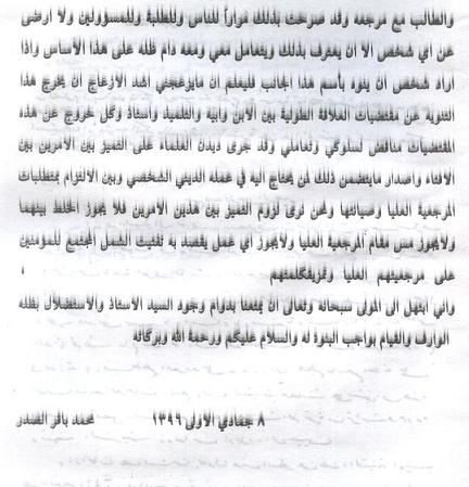 وقد أعطى السيّد الصدر (رحمه الله) هذه المنشورات إلى أحد الحاضرين لقراءتها على المجتمعين، وكان بعضها صادراً داخل العراق ضدّ النظام وموزّعاً في عدّة مدن منه، والبعض الآخر عبارة عن بيانات صادرة خارج العراق تطالب بالحريّة ورفع القمع.