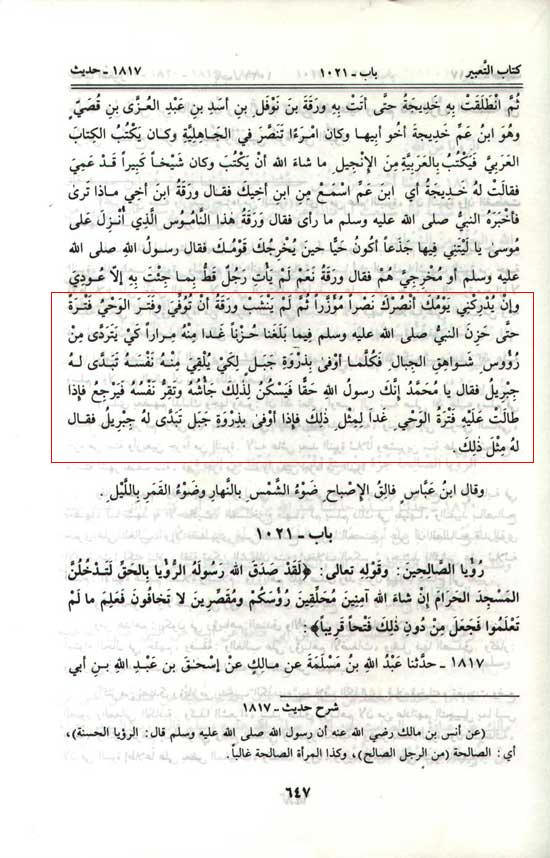 - حدثنا : يحيى بن بكير ، حدثنا : الليث ، عن عقيل ، عن إبن شهاب ح وحدثني : عبد الله بن محمد ، حدثنا : عبد الرزاق ، حدثنا : معمر قال الزهري : فأخبرني عروة ، عن عائشة (ر) أنها قالت : أول ما بدئ به رسول الله (ص) من الوحي الرؤيا الصادقة في النوم فكان لا يرى رؤيا إلاّ جاءت مثل فلق الصبح فكان يأتي حراء فيتحنث فيه وهو التعبد الليالي ذوات العدد ويتزود لذلك ثم يرجع إلى خديجة فتزوده لمثلها حتى فجئه الحق وهو في غار حراء فجاءه الملك فيه فقال : إقرأ فقال له النبي (ص) : فقلت : ما أنا بقارئ فأخذني فغطني حتى بلغ مني الجهد ثم أرسلني فقال : إقرأ فقلت : ما أنا بقارئ فأخذني فغطني الثانية حتى بلغ مني الجهد ثم أرسلني فقال : إقرأ فقلت : ما أنا بقارئ فأخذني فغطني الثالثة حتى بلغ مني الجهد ثم أرسلني فقال : إقرأ بإسم ربك الذي خلق حتى بلغ علم الإنسان ما لم يعلم فرجع بها ترجف بوادره حتى دخل على خديجة فقال : زملوني زملوني فزملوه حتى ذهب عنه الروع فقال : يا خديجة ما لي وأخبرها الخبر وقال : قد خشيت على نفسي فقالت له : كلا أبشر فوالله لا يخزيك الله أبداً إنك لتصل الرحم وتصدق الحديث وتحمل الكل وتقري الضيف وتعين على نوائب الحق ثم إنطلقت به خديجة حتى أتت به ورقة بن نوفل بن أسد بن عبد العزى بن قصي وهو إبن عم خديجة أخوأبيها وكان أمراً تنصر في الجاهلية وكان يكتب الكتاب العربي فيكتب بالعربية من الإنجيل ما شاء الله أن يكتب وكان شيخاً كبيراً قد عمي فقالت له خديجة : أي إبن عم أسمع من إبن أخيك فقال ورقة : إبن أخي ماذا ترى فأخبره النبي (ص) ما رأى فقال ورقة : هذا الناموس الذي أنزل على موسى يا ليتني فيها جذعاً أكون حياً حين يخرجك قومك فقال رسول الله (ص) : أومخرجي هم فقال ورقة : نعم لم يأت رجل قط بمثل ما جئت به إلاّ عودي وإن يدركني يومك أنصرك نصرا مؤزرا ثم لم ينشب ورقة أن توفي وفتر الوحي فترة حتى حزن النبي (ص) فيما بلغنا حزناًً غداً منه مراراًًً كي يتردى من رءوس شواهق الجبال فكلما أوفى بذروة جبل لكي يلقي منه نفسه تبدى له جبريل فقال : يا محمد إنك رسول الله حقاً فيسكن لذلك جأشه وتقر نفسه فيرجع فإذا طالت عليه فترة الوحي غداً لمثل ذلك فإذا أوفى بذروة جبل تبدى له جبريل فقال له : مثل ذلك ، قال إبن عباس : فالق الإصباح ضوء الشمس بالنهار وضوء القمر بالليل.
