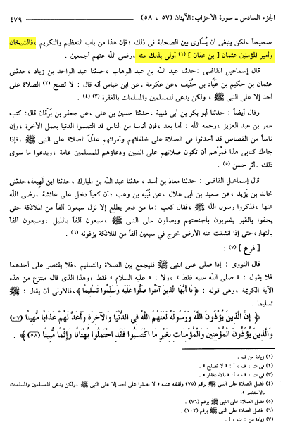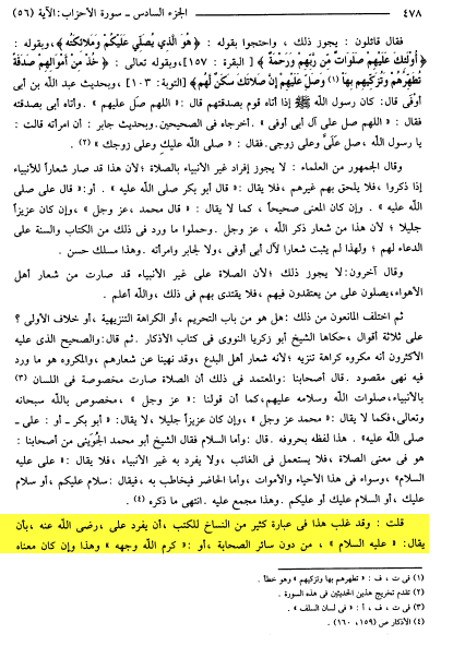 (قلت: وقد غلب هذا في عبارة كثير من النساخ للكتب، أن يفرد علي، رضي الله عنه، بأن يقال: (عليه السلام)، من دون سائر الصحابة، أو (كرم الله وجهه)، وهذا وإن كان معناه صحيحا، لكن ينبغي أن يساوى بين الصحابة في ذلك؛ فإن هذا من باب التعظيم والتكريم، فالشيخان وأمير المؤمنين عثمان بن عفان أولى بذلك منه، رضي الله عنهم أجمعين).
