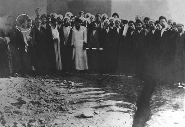 [صورة أعمال الحفر لمبنى المدرسة الحُجتيّة في مدينة قم المقدسة، حيث يظهر في وسط الصورة المرحوم آية الله السيِّد محمّد حُجّت واقفاً بقِباء أبيض ومن دون عباءة، وبجانبه معمار المدرسة ناظراً للخريطة التي في يده, وهذه الخريط قد وُضعت من قبل المرحوم العلاّمة الطباطبائي رحمة الله عليه،