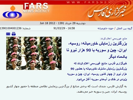أعلنت وكالة فارس للأنباء شبه الرسمية القريبة من الحرس الثوري الإيراني اليوم الاثنين قيام كل من إيران وروسيا والصين وسوريا بمناورة عسكرية مشتركة قوامها 90 ألف جندي، على أن تتم على الأراضي السورية بعد شهر من الآن.
