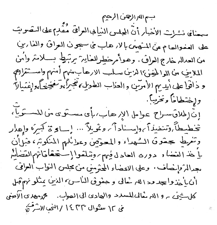 بيان سماحة آية الله الشيخ محمد مهدي الآصفي حفظه الله تعالى