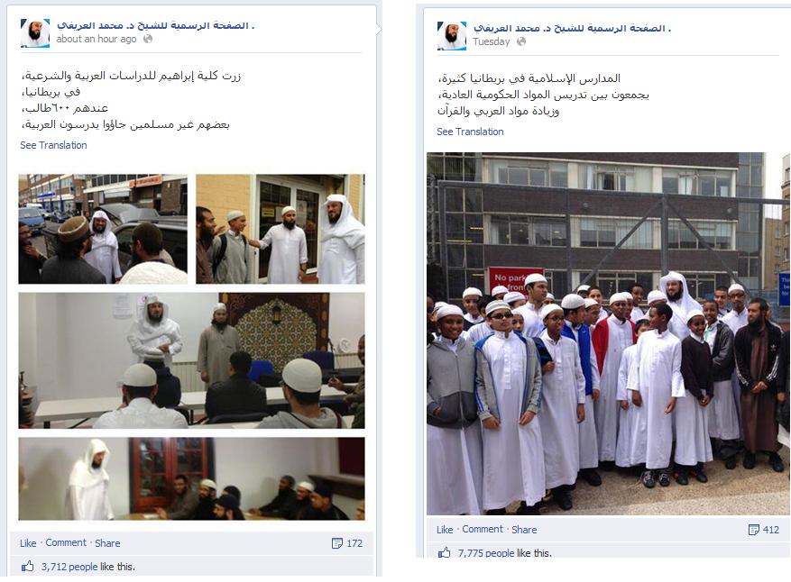 بعد ساعات فقط من نشر صور الشيخ السعودي ومفتي الارهابيين محمد العريفي في لندن ( ومنمها صورة يقف فيها مع امرأة متبرجة ) وانتشار خبر دعوته الى ( الجهاد ) في سوريا ضد ( العلويين ) حزم العريفي حقائبه ثانية وغادر الفندق سرا بعد ان قامت سفارة عربية في لندن باخباره ان شبانا سوريين غاضبين شوهدوا حول الفندق الذي ينزل فيه وكان احدهم يحمل سكينا ...وترددت انباء عن وصوله الى الرياض ... وقد انضمت الصحف العربية الصادرة في لندن الى الصحف المصرية في الهجوم على العريفي ... فتحت عنوان ( العريفي يجاهد في لندن ) هاجمت جريدة العرب التي تصدر في لندن العريفي وفتواه التي اطلقها في مصر وطالب فيها المصريين بارسال اولادهم للجهاد في سوريا