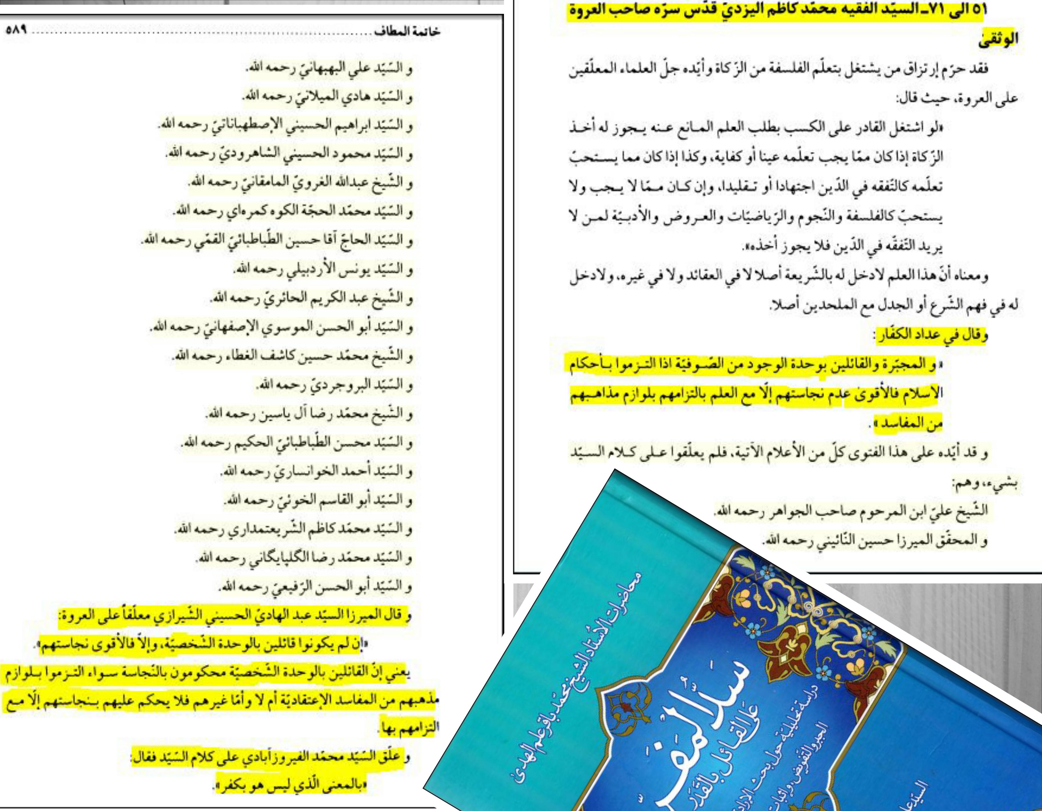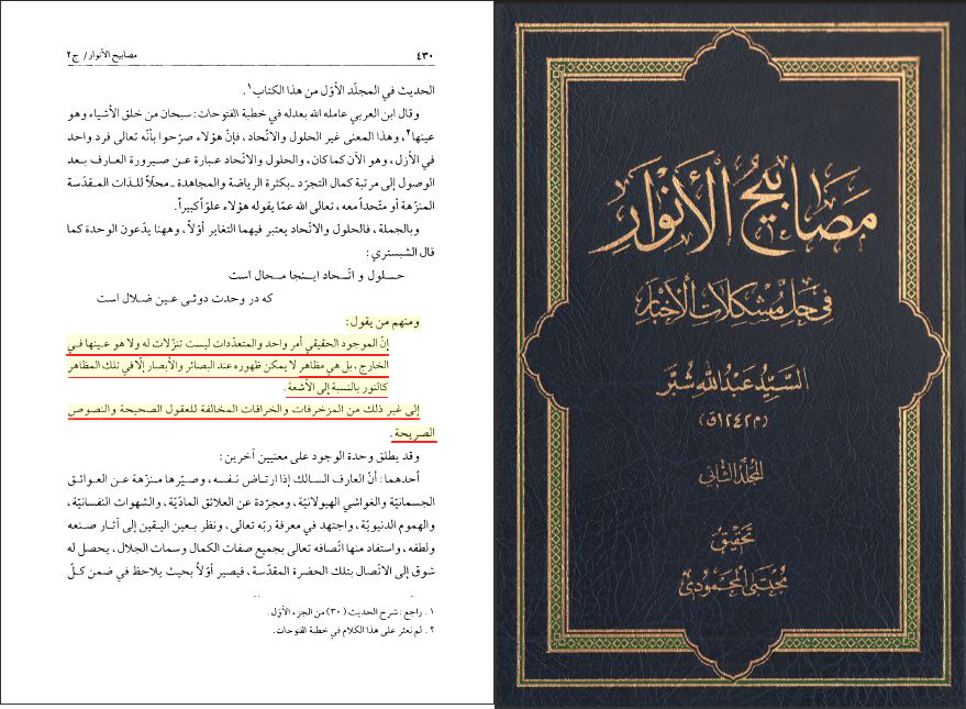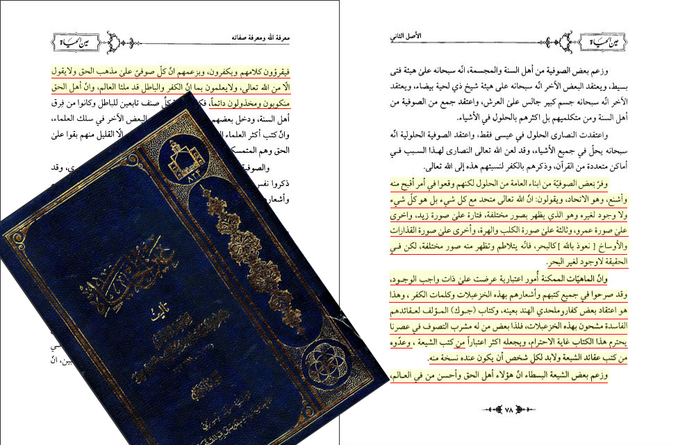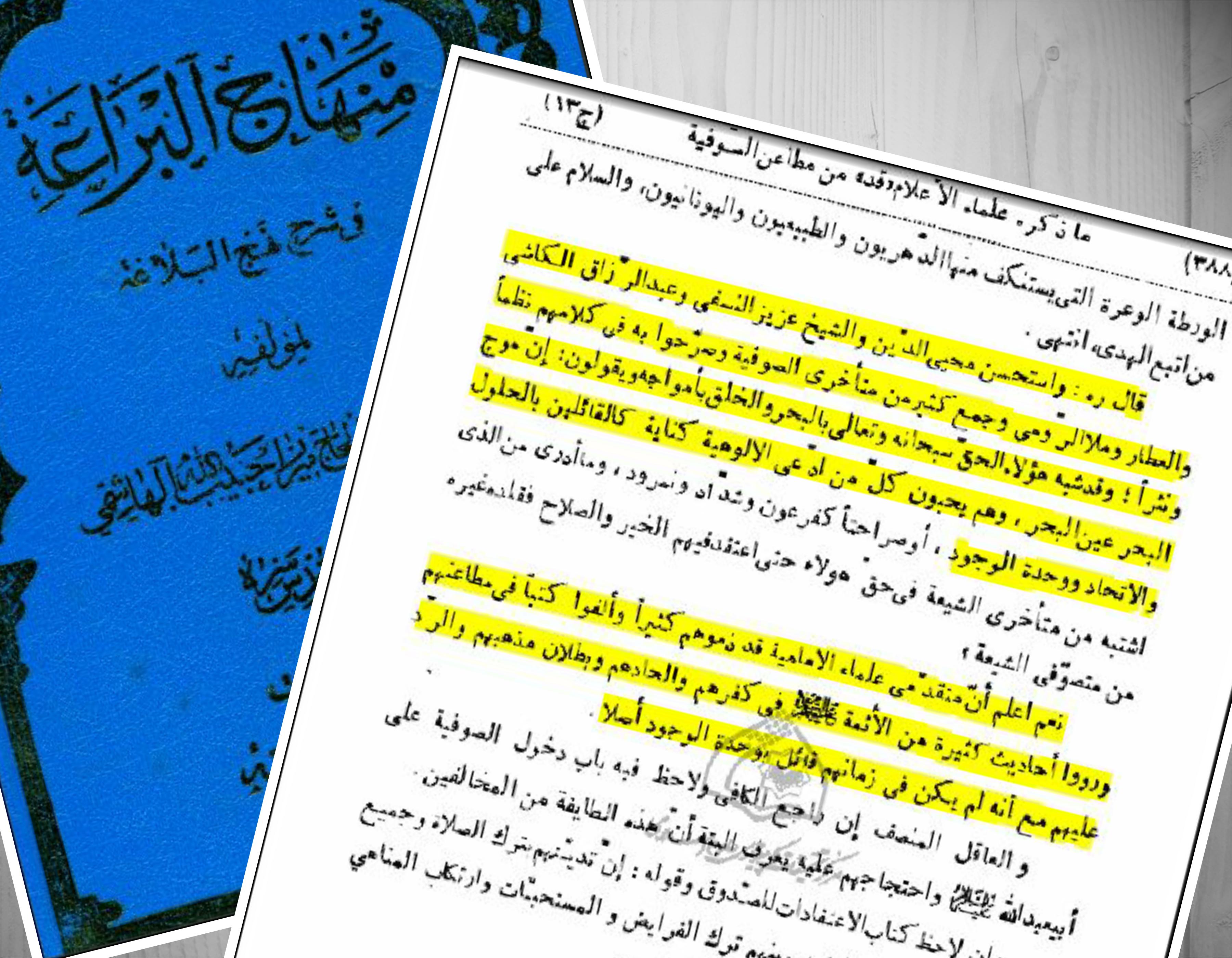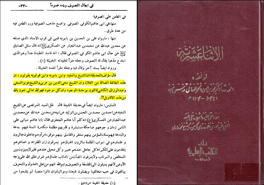 وزعم بعض الشيعة البسطاء أن هؤلاء(اي العرفاء والصوفية) أهل الحق وأحسن من في العالم، فيقرؤون كلامهم ويكفرون، وبزعمهم أن كل صوفي على مذهب الحق ولا يقول إلا من الله تعالى، ولا يعلمون أن الكفر والباطل قد ملئا