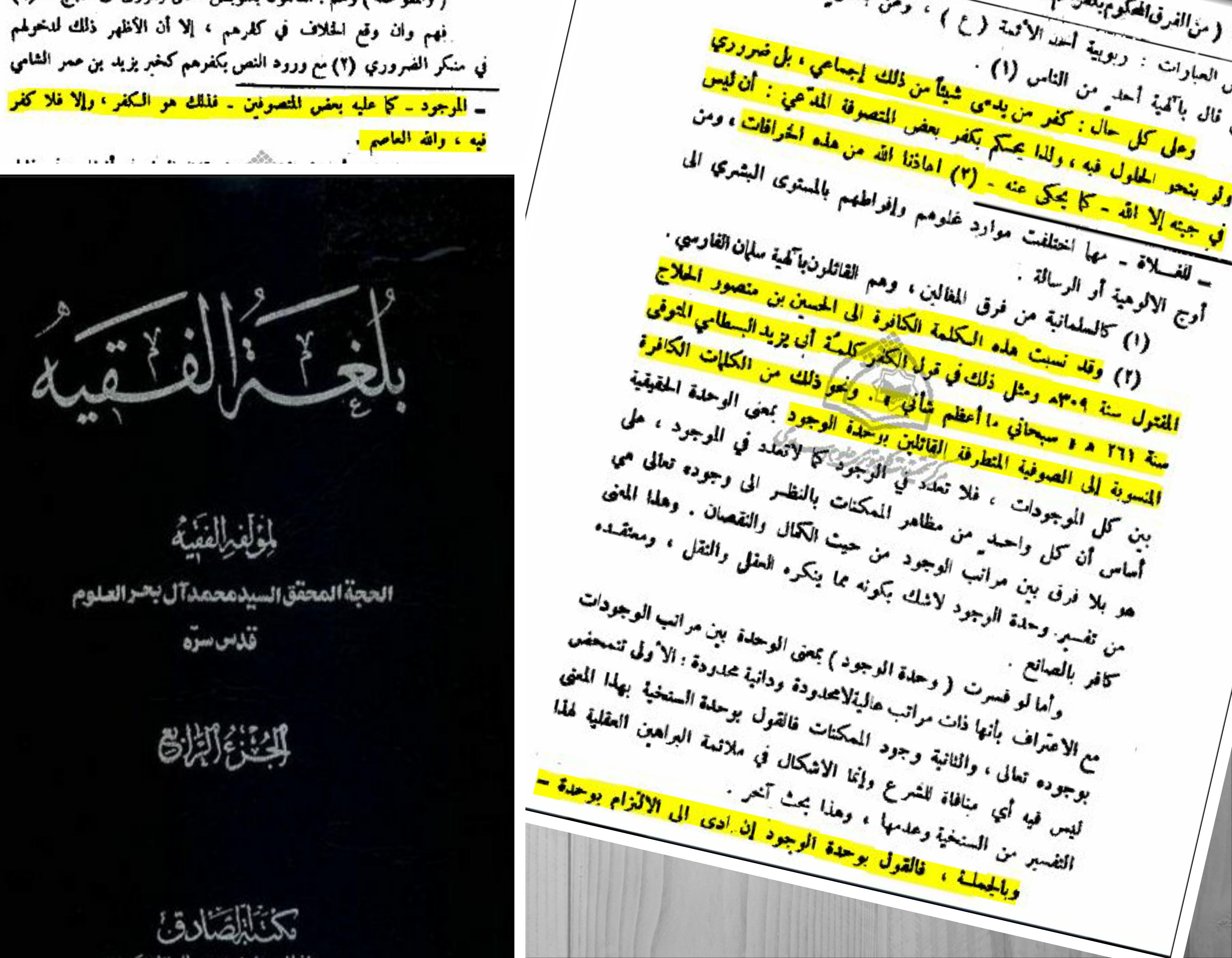 يقول محمد حسين ال كاشف الغطاء : على أن تلك الفرق لا تقول بمقالة النصارى، بل خلاصة مقالتهم بل ضلالتهم أن الإمام هو الله سبحانه ظهورا أو اتحادا أو حلولا ، أو نحو ذلك مما يقول به كثير من متصوفة الاسلام ومشاهير مشايخ الطرق ، وقد ينقل عن الحلاج بل والكيلاني والرفاعي والبدوي وأمثالهم من الكلمات وإن شئت فسمها كما يقولون شطحات ما يدل بظاهره على أن لهم منزلة فوق الربوبية ، وأن لهم مقاما زائدا عن الألوهية ( لو كان ثمة موضع لمزيد ) وقريب من ذلك ما يقول به أرباب وحدة الوجود أو الموجود.