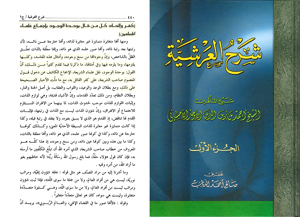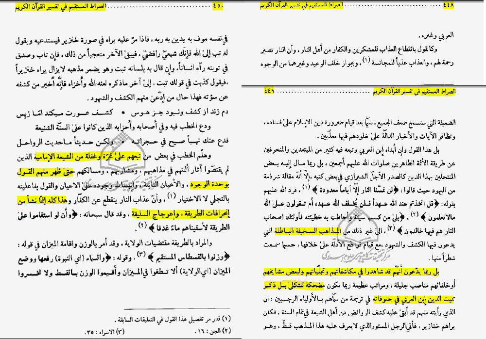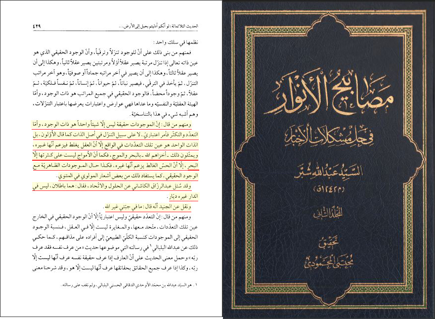 وفيه : قال بعضهم(ابن عربي) : فأن قلت بالتشبيه كنت محدداً , وان قلت بالتنزيه كنت مقيدا , وان قلت بالامرين كنت مسددا , وكنت اماما في المعارف سيدا
