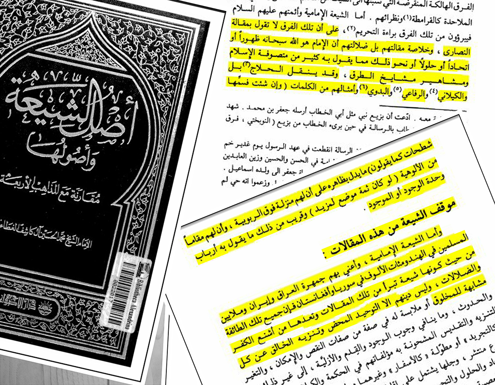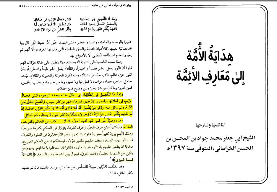 أما الشيعة الإمامية وأعني بهم جمهرة العراق وإيران وملايين من مسلمي الهند ومئات الألوف في سوريا والأفغان فإن جميع تلك الطائفة من حيث كونها شيعة يبرأون من تلك المقالات، ويعدونها من أشنع [ أشكال ] الكفر والضلالات ، وليس دينهم إلا التوحيد المحض ، وتنزيه الخالق عن كل مشابهة للمخلوق.