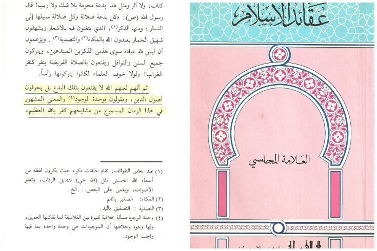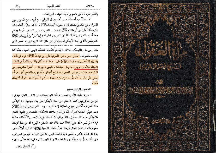 بكلام العلامة المجلسي (طيب الله تربته) يقول : العلامة المجلسي :أنهم (العرفاء والمتصوفة) لعنهم الله لا يقنعون بتلك البدع بل يحرفون أصول الدين ويقولون بوحدة الوجود والمعنى المشهور في هذا الزمان المسموع من مشايخهم كفر بالله