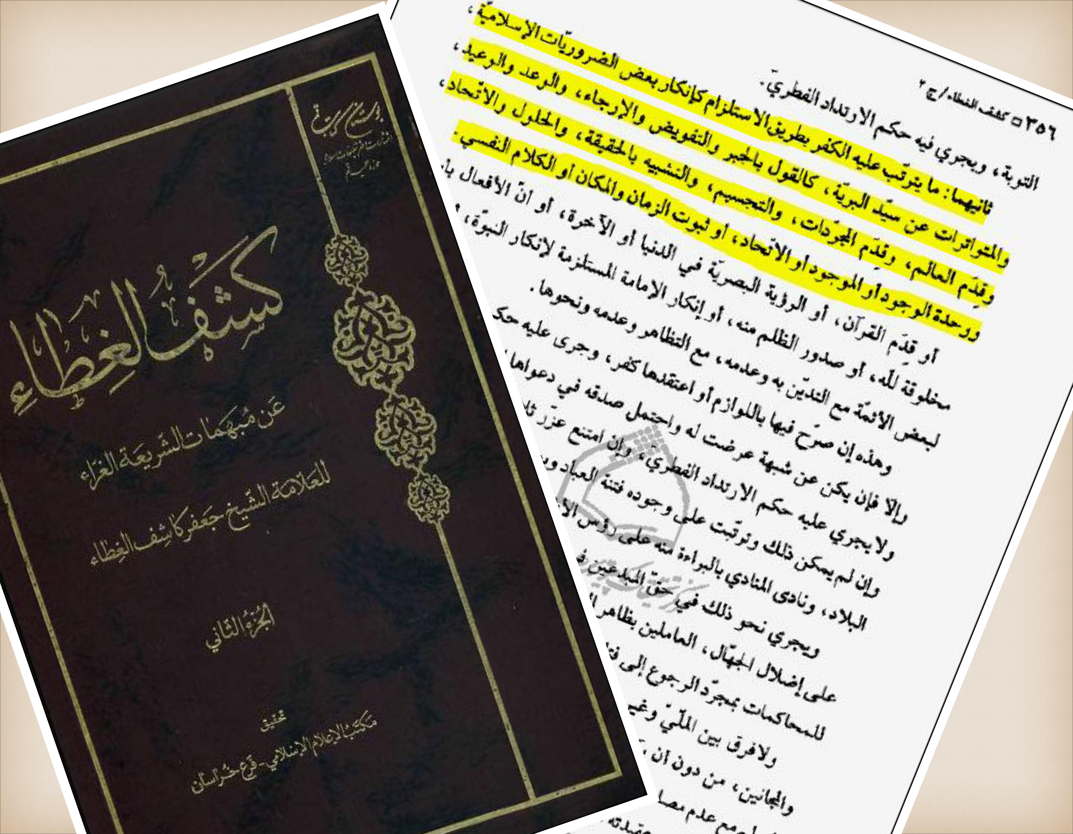 يقول الشيخ جعفر ال كاشف الغطاء : ما يترتب عليه الكفر بطريق الاستلزام كإنكار بعض الضروريات الاسلامية , والمتواترات عن سيد البرية , كالقول بالجبر والتفويض والارجاء , والوعد والوعيد , وقدم العالم , وقدم المجردات , والتجسيم, والتشبيه بالحقيقة , والحلول والاتحاد , ووحدة الوجود او الموجود او الاتحاد , أو ثبوت الزمان والمكان والكلام النفسي.!!