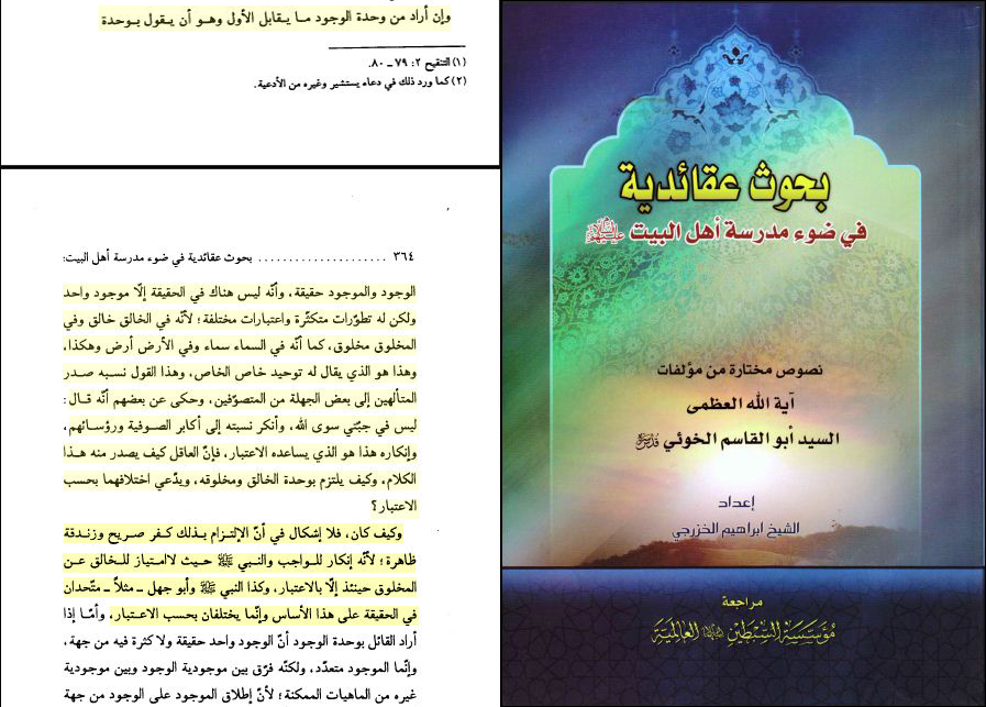 يقول المحقق الخوئي (قدس سره) : بعد ذكر اصناف من القائلين بوحدة الوجود وانواعها فيقول القائل بوحدة الوجود إن أراد من وحدة الوجود ما يقابل الأوّل ، وهو أن يقول بوحدة الوجود والموجود حقيقة وأنّه ليس هناك في الحقيقة إلاّ موجود واحد ولكن له تطوّرات متكثّرة واعتبارات مختلفة، لأنّه في الخالق خالق وفي المخلوق مخلوق ، كما أنّه في السّماء سماء وفي الأرض أرض وهكذا ، وهذا هو الّذي يقال له : توحيد خاصّ الخاص وهذا القول نسبه صدر المتألهين إلى بعض الجهلة من المتصوفين وحكي عن بعضهم أنّه قال : ليس في جبّتي سوى اللّه وأنكر نسبة إلى أكابر الصوفية وإنكاره هذا هو الذي يساعد على الاعتبارفإنّ العاقل كيف يصدر منه هذا الكلام ، وكيف يلتزم بوحدة الخالق ومخلوقه ويدّعي اختلافهما بحسب الاعتبار! وكيف كان ، فلا إشكال في أنّ الالتزام بذلك كفر صريح وزندقة ظاهرة!