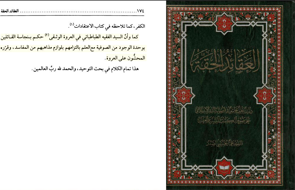 يقول السيد علي الحسيني الصدر : كما وان السيد الفقيه الطباطبائي في العروة الوثقى حكم بنجاسة القائلين (بوحدة الوجود) من الصوفية مع العلم بالتزامهم بلوازم مذهبهم من المفاسد , وقرره المحشون على العروة