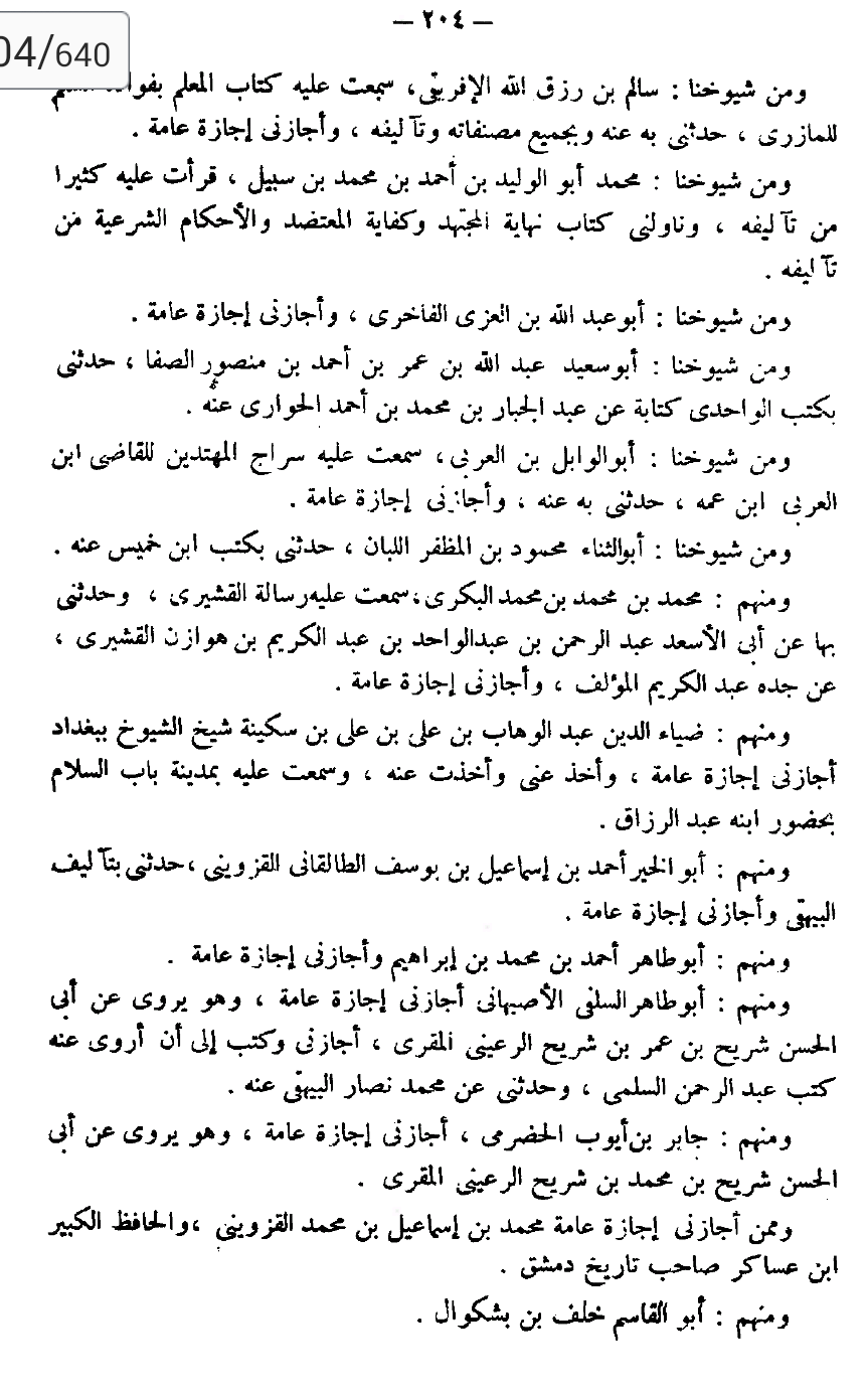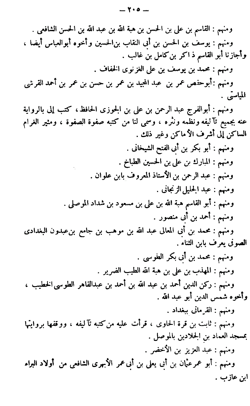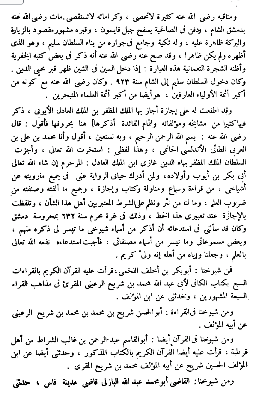 وقد ذكر ترجمة للشيخ الاكبر ابن عربي بها مجموعة من شيوخه وكتبه في علم الحديث والحقيقة