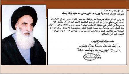 دانت المرجعية الدينة العليا، التعرض لصحابة رسول الله (ص)، مؤكدة انه امر مخالف لما امر به ائمة اهل البيت عليهم السلام . واكد المرجع الشيعي الاعلى السيد علي السيستاني أن شتم الصحابة "تصرف مدان ومستنكر جداً وعلى خلاف ما أمر به أهل البيت عليهم السلام شيعتهم". وجاء ذلك جوابًا على سؤال لأحد المواطنين عن موقفه من قيام "مجموعة من الناس" بسب عمر وعائشة " خاصة أنه يتعلق بسب الرموز الدينية لأخوتنا السنة".