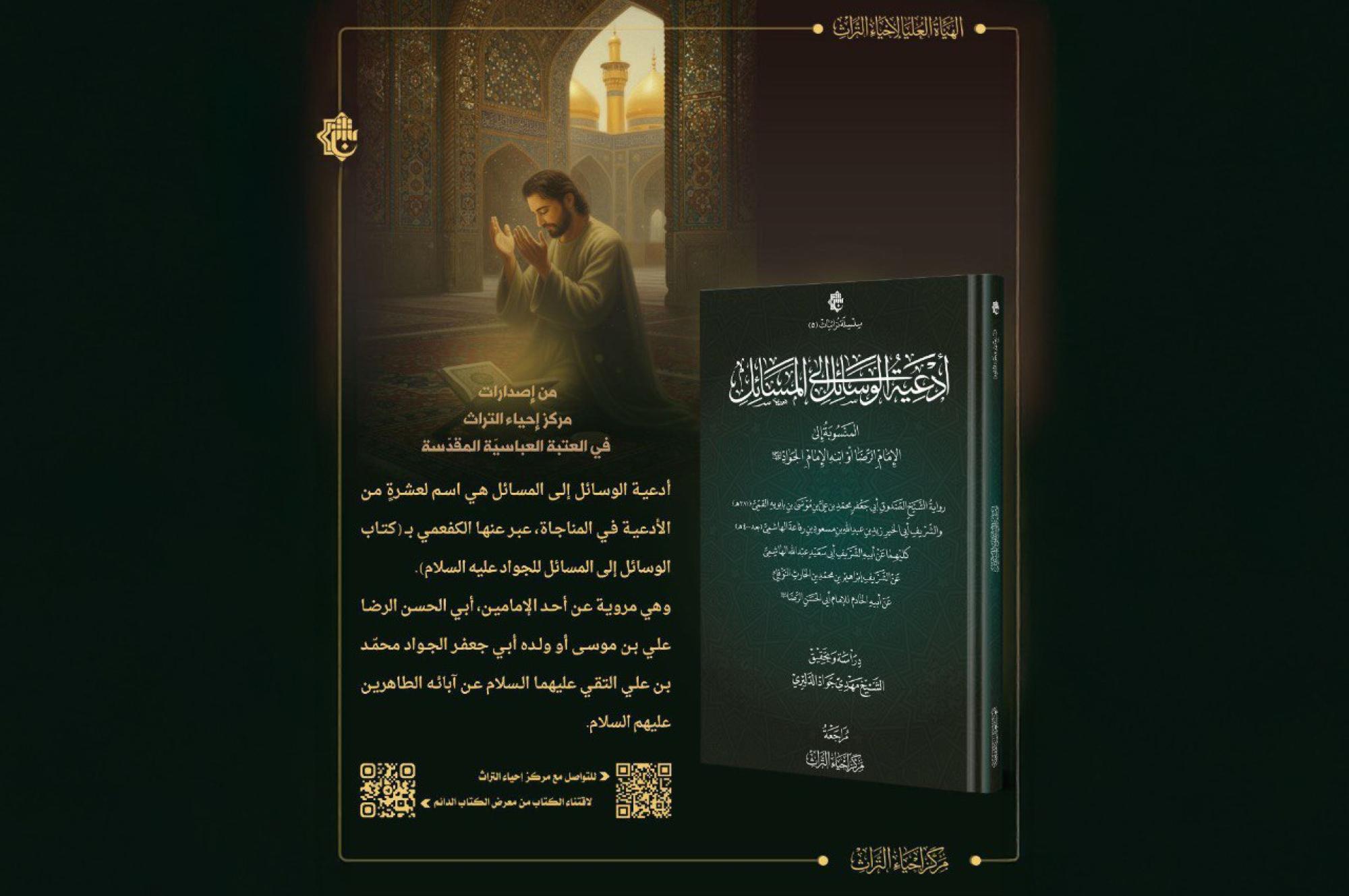 أصدر مركزُ إحياء التراث التابع للهيأة العُليا لإحياء التراث في العتبة العبّاسية المقدّسة، كتاب أدعية الوسائل إلى المسائل المنسوبة إلى الإمام الرضا وابنه الإمام الجواد(عليهما السلام). وقد تولّى دراسة الكتاب وتحقيقه الشيخ مهدي جواد الدليري، حيث يضمّ هذا العمل عشرة أدعية مناجاة، عبّر عنها العلّامة الكفعمي بعنوان (كتاب الوسائل إلى المسائل للجواد -عليه السلام-). تتناول هذه الأدعية موضوعاتٍ متنوّعة، أبرزها: الشكر، الاستخارة، قضاء الحوائج، وغيرها من مضامين روحيّة وعقائديّة عميقة، وتُروى الأدعية عن الإمامين الرضا والجواد(عليهما السلام).
