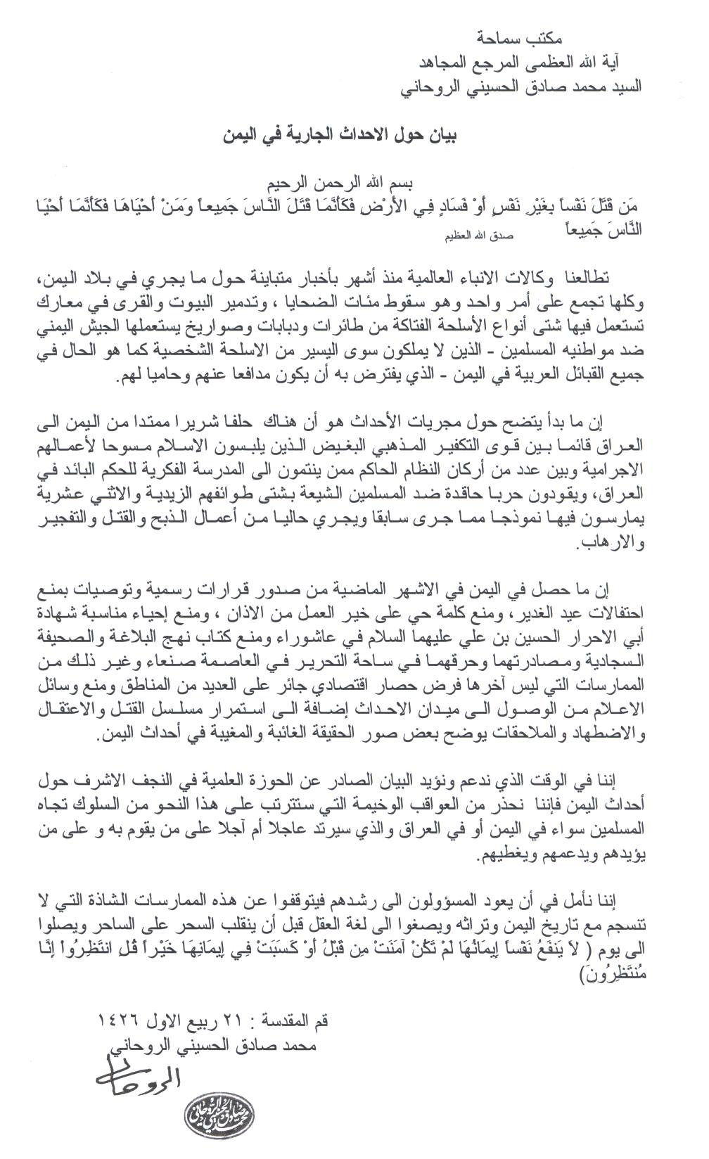 إننا في الوقت الذي ندعم ونؤيد البيان الصادر عن الحوزة العلمية في النجف الاشرف حول أحداث اليمن فإننا نحذر من العواقب الوخيمة التي ستترتب على هذا النحو من السلوك تجاه المسلمين سواء في اليمن أو في العراق والذي سيرتد عاجلا أم آجلا على من يقوم به و على من يؤيدهم ويدعمهم ويغطيهم.